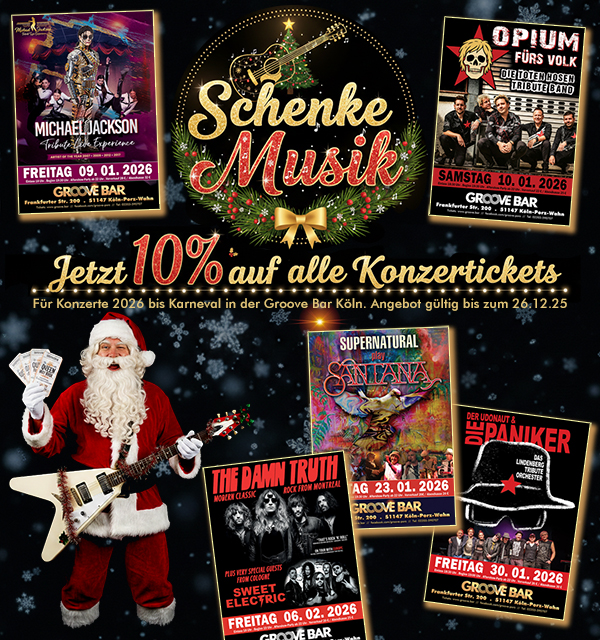 Was willst du noch durch die Läden hetzen für Socken, Krawatten und Süssigkeiten – schenke ein Erlebnis! Livemusik in der Groove Bar – bis zum 26.12.25 sogar mit 10% Rabatt.